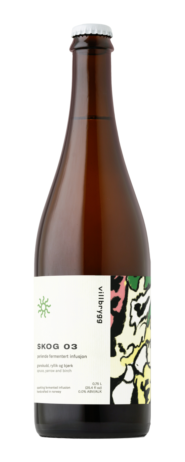 SKOG 03 er en perlende frisk botanisk drikk med noter av sitrus, ingefær og barnål. Den er laget av en fermentert infusjon av granskudd, sitrongress, ryllik og bjørkeblader.